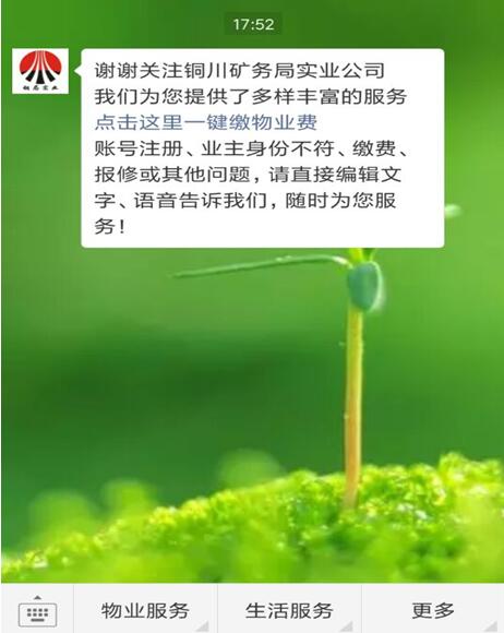 該微信號負責人介紹說,現(xiàn)在,有手機打開銅局實業(yè)微信號,首頁為轄區(qū)居民提供了物業(yè)服務、生活服務、咨詢指引功能。進入物業(yè)服務界面,業(yè)主可以隨時查詢自己家的物業(yè)費情況;通知、公告等信息可第一時間獲??;公共設施損壞,拍個照片,上傳到服務平臺,馬上就會有專人前去維修……銅局實業(yè)后勤服務正在逐步實現(xiàn)“智慧物業(yè)管理”,由對“物的管理”轉變?yōu)閷Α叭说姆铡?,受眾服務不受時間、空間、距離限制,“互聯(lián)網(wǎng)+物業(yè)”在改變傳統(tǒng)物業(yè)服務模式的同時,為全局職工群眾帶來了更多的便利。
