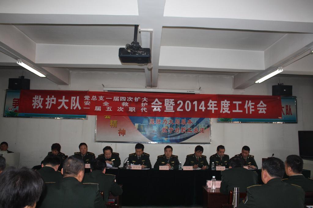 1月27日上午8:00時(shí)整,救護(hù)大隊(duì)黨總支一屆四次擴(kuò)大會(huì)、一屆五次職代會(huì)、安全救護(hù)會(huì)暨2014年度工作會(huì)在莊嚴(yán)的國歌聲開幕。救護(hù)大隊(duì)黨政領(lǐng)導(dǎo)和各科室、各中隊(duì)主要負(fù)責(zé)同志、職工代表、先進(jìn)集體和先進(jìn)個(gè)人代表成員等50余人參加了大會(huì)。
