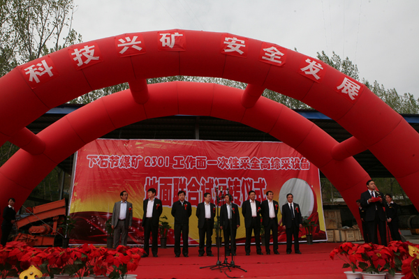 公司副總經(jīng)理、安監(jiān)局局長劉水利在儀式上發(fā)表了熱情洋溢的講話。下石節(jié)礦2301一次性采全高工作面,是礦業(yè)公司振興渭北老礦區(qū)的一項重大技術(shù)引進項目,這個項目的成功推廣應(yīng)用,對實現(xiàn)煤礦安全高效、提高資源回收率和進一步提升機械化裝備水平具有深遠的意義,將對推動礦業(yè)公司健康、可持續(xù)發(fā)展起到積極的作用,為進一步“解放思想、振興銅煤”提供強勁的動力。他希望全礦廣大職工,在今后的工作中繼續(xù)發(fā)揚銅煤人迎難而上、不屈不撓的精神,在學(xué)中干、在干中學(xué),盡快熟悉掌握新技術(shù)、新設(shè)備,為2301工作面正式投產(chǎn)創(chuàng)造有利條件,為礦業(yè)公司厚煤層開采積累先進的技術(shù)經(jīng)驗。
