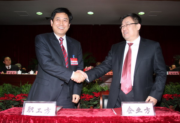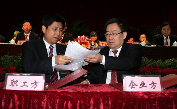 公司企業(yè)方首席代表、公司總經(jīng)理宋志剛與職工方首席代表、公司黨委副書記、礦區(qū)工會主席劉啟科簽訂《集體合同》