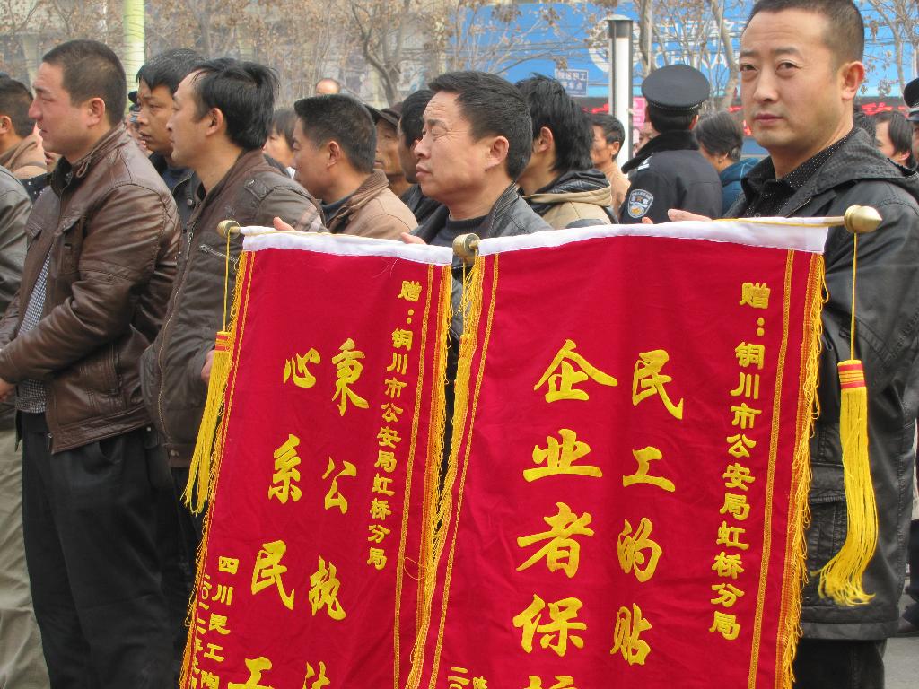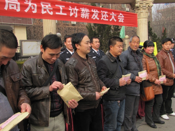1月17日14時,銅川市方舟廣場錦旗爍爍,爆竹聲聲。銅川虹橋分局為民工討薪發(fā)還大會正在召開,14個小工隊218名民工工資111多萬元發(fā)還到民工代表手中,民工代表為虹橋公安分局送上 “民工的貼心人,企業(yè)者保護神”、“秉公執(zhí)法 心系民工”等錦旗。