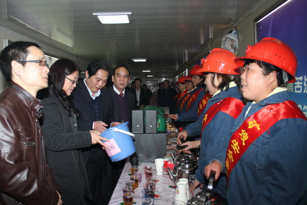 下午3時(shí)許,黨柏峰、梁秀俠一行到礦后,欣聞該礦四點(diǎn)班職工將要更衣入井、八點(diǎn)班的職工即將升井,正是“礦嫂服務(wù)隊(duì)”開(kāi)展活動(dòng)、展現(xiàn)風(fēng)采的時(shí)機(jī)。他們帶著十分好奇與興奮的心情,沒(méi)顧得上考慮休息,就立即趕到井口,投入對(duì)“礦嫂服務(wù)隊(duì)”進(jìn)行現(xiàn)場(chǎng)采訪與親歷她們的活動(dòng)之中。他們經(jīng)過(guò)井口文化長(zhǎng)廊,來(lái)到礦嫂服務(wù)活動(dòng)現(xiàn)場(chǎng),當(dāng)看到一個(gè)個(gè)身披“礦嫂安全親情服務(wù)隊(duì)”標(biāo)志,著裝整齊規(guī)范、滿面笑容,正在為上下井職工熱情服務(wù)的礦嫂們,黨柏峰、梁秀俠一行激動(dòng)地與她們一一握手,向她們問(wèn)好。在活動(dòng)間隙,黨柏峰、梁秀俠一行不失時(shí)機(jī)與礦嫂們和上下井職工親切交談,了解有關(guān)情況。