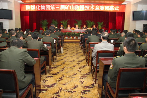 9月22日下午,陜煤化集團(tuán)第三屆礦山救援技術(shù)競賽勝利閉幕。競賽活動閉幕式在煤業(yè)賓館餐廳二樓會議室舉行。煤化集團(tuán)安監(jiān)部經(jīng)理、陜西煤業(yè)股份有限公司副總經(jīng)理李文革,銅川礦業(yè)公司副總經(jīng)理、安監(jiān)局長劉水利,副總經(jīng)理、總工程師劉啟科,陜煤化集團(tuán)安全、生產(chǎn)、環(huán)保部總工、大會副裁判長歸會林,集團(tuán)第三屆礦山救援技術(shù)競賽裁判長陳學(xué)等出席,銅川礦業(yè)公司副總經(jīng)理封建利主持閉幕式。各參賽單位領(lǐng)隊、參賽隊員、教練員、裁判員以及前來觀摩競賽的人員等200余人參加了閉幕式。