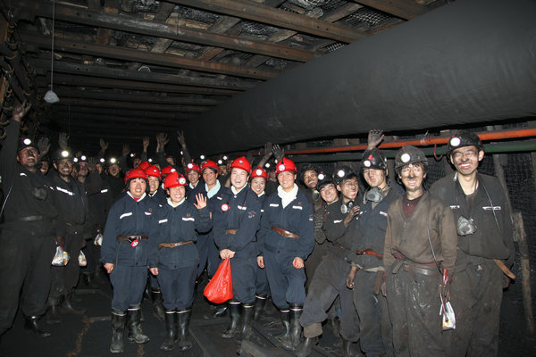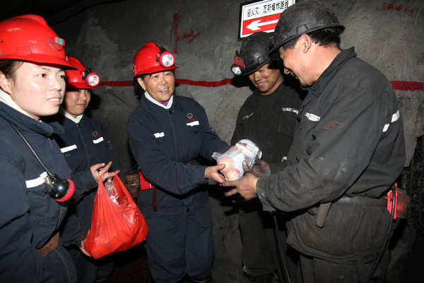這次參加慰問的12名礦嫂雖長期生活在礦山,但她們對井下一線的生產(chǎn)現(xiàn)狀也不甚了解。在乘坐了半個多小時的人車,一路徒步幾處近200米斜巷和近千米的皮帶巷,大家個個汗流浹背、筋疲力盡,初次下井的新鮮感一掃而光。到達(dá)掘進(jìn)二隊294上順工作面后,礦嫂們立即把裝有月餅、水果的中秋禮包送到了職工手中,同時送上安全囑托,叮囑井下作業(yè)的親人們一定要按章操作,注意安全,受到了工作面干部職工的熱情歡迎。在現(xiàn)場,職工姜繼峰看到自己的妻子滿心歡喜,激動萬分。而妻子看到滿臉征塵,渾身濕透的丈夫,含淚哽咽的說到:“沒想到他每天在井下工作這么辛苦,想想之前下班回家,我還和他找別扭耍小性,真不應(yīng)該,作為妻子以后在家里我一定好好的照顧他,讓他養(yǎng)好精神全心投入每天的辛苦工作”。臨行時,全體礦嫂共同以一曲“十五的月亮”祝福親人,深情的歌聲回蕩在千尺井巷,潮水般的暖流在礦工們內(nèi)心涌動,職工們品嘗著香甜的月餅,感受著礦井領(lǐng)導(dǎo)的關(guān)懷及親人的祝福,一切疲憊都在那一刻化為烏有。