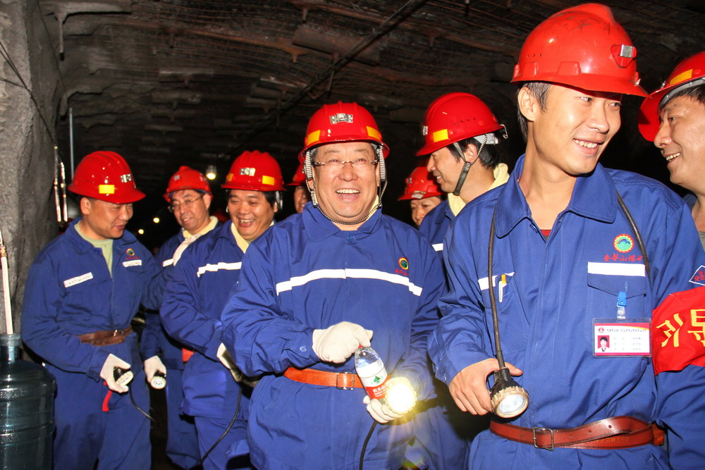 公司總經(jīng)理宋志剛?cè)刖芭c金華山礦礦長寧文衛(wèi)等礦領(lǐng)導(dǎo)親切交談