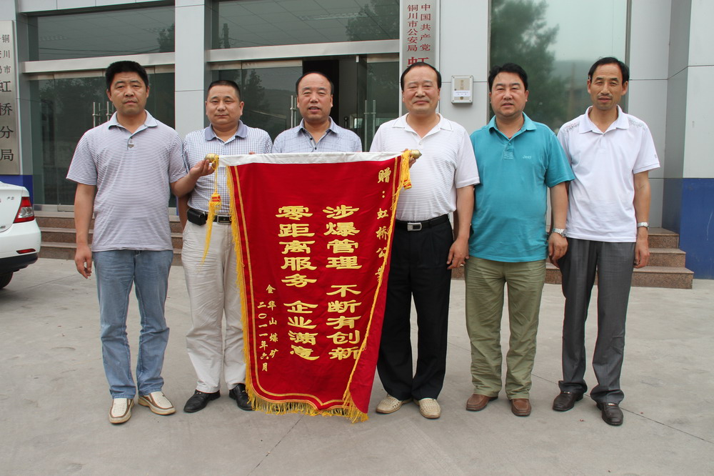 6月22日上午,一串響亮的鞭炮聲在銅川市公安局虹橋分局院內(nèi)響起。大約11時(shí)10分,金華山礦黨委副書記劉貴平、副總工程師、安質(zhì)科科長劉星河、供應(yīng)科科長趙德廣等一行代表礦黨政將書寫“涉爆管理不斷創(chuàng)新 零距離服務(wù)企業(yè)滿意”字樣的鮮紅錦旗送到虹橋公安分局局長趙宏濤手中。