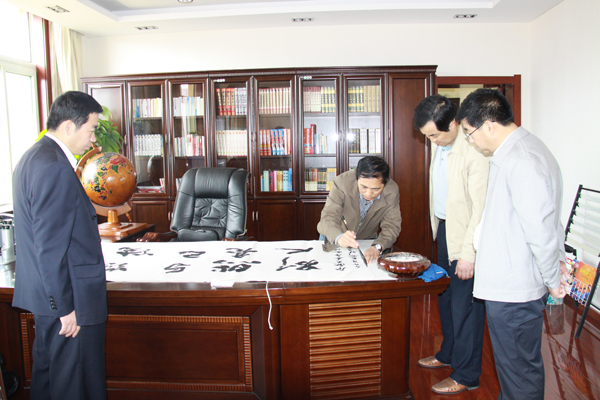 該礦黨政領導熱情接待了王芳聞秘書長一行人,并介紹了該礦近些年來企業(yè)發(fā)展概況。隨后,作家高鴻在礦長解耀明的陪同下深入井下,對井下治理和生產情況實地了解,高度贊揚了王石凹礦職工熱情、樸實、積極樂觀的精神風貌;王芳聞秘書長、李德強部長則在黨委書記杜進良的陪同下,冒著細雨,參觀了該礦的井口安全文化長廊、班組建設園地、廉政花園、黨務公開欄、廉潔教育室、安全教育室、榮展室等,從多方面、多角度地了解了該礦的企業(yè)文化建設,充分肯定了該礦的企業(yè)文化建設模式和發(fā)展思路。在采風過程中,王秘書長還與部分退休職工、勞動模范、青年職工等進行了面對面的交流和采訪,深入地了解了該礦不同時期的發(fā)展情況。 王石凹煤礦是一個具有五十年歷史的老礦井,豐富的文化底蘊和濃厚的文化氣息,給二位留下了深刻的印象。今年是該礦的五十歲生日,礦黨政正全力籌備五十大慶活動,當?shù)弥@一消息時,王秘書長和高作家表示了衷心的祝賀,并表示如有機會一定還會再來王石凹的。激動之時、動情之處,高鴻作家為王石凹礦揮毫潑墨,寫下了“厚德載物”、“平安是?!薄ⅰ皩殑︿h從磨礪出、梅花香自苦寒來”等書法藝術作品。