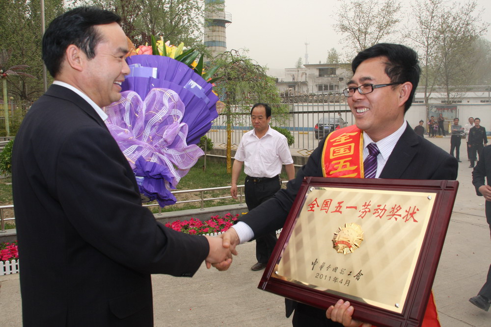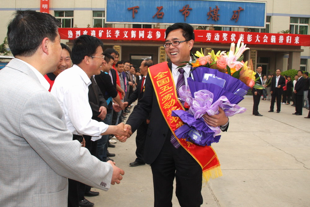 3時40分,李文輝驅(qū)車駛進(jìn)礦區(qū)大門,一時間,鑼鼓喧天夾道歡迎,鞭炮齊鳴熱烈祝賀。轎車停在機(jī)關(guān)院內(nèi),李文輝同志抱著全國“五一”勞動獎狀下車后,頓時間,機(jī)關(guān)院內(nèi)響起雷鳴般的掌聲,黨委書記李國璧手捧鮮花健步走上前去,代表全礦萬名職工家屬獻(xiàn)給載譽(yù)歸來的李文輝同志,然后接過他手中的全國“五一”勞動獎狀獎牌舉過頭頂向大家展示,整個機(jī)關(guān)院那一瞬間沸騰了,掌聲、歡呼聲在院內(nèi)上空響徹,熱鬧之極。李文輝滿面笑容的與列隊(duì)迎接的全體同志一一握手致意,共同慶祝下石節(jié)煤礦取得的這一至高榮譽(yù)。