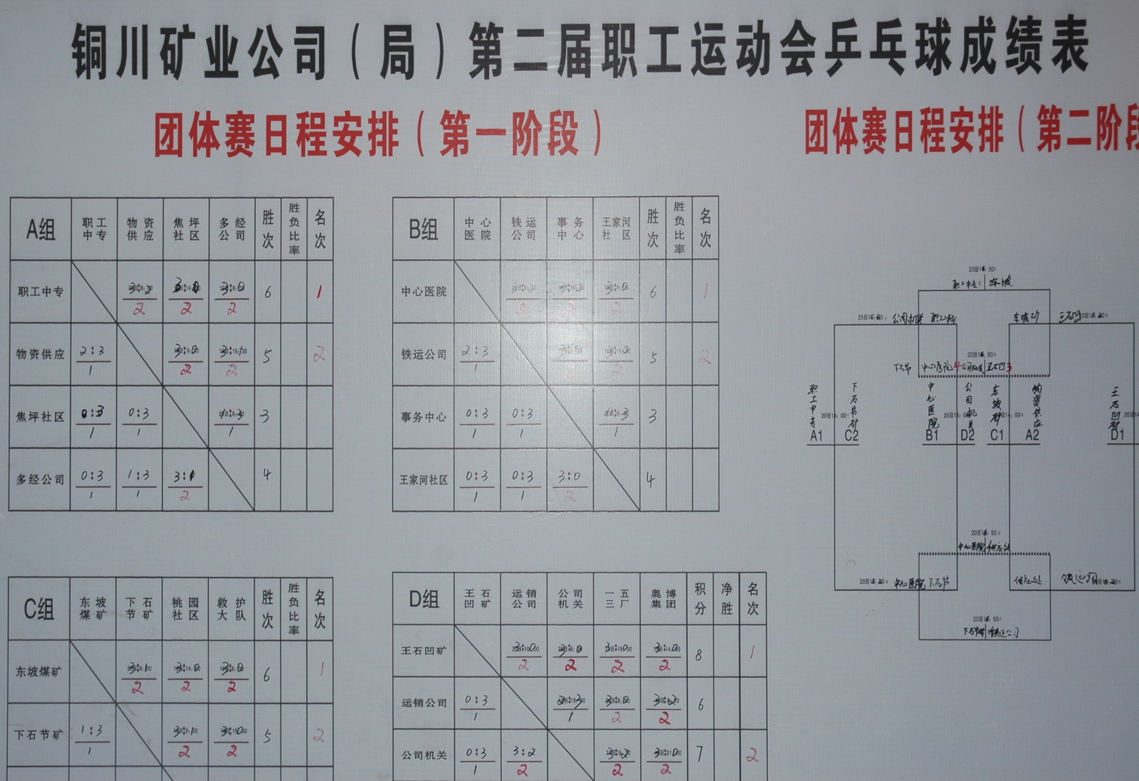 本次乒乓球比賽從19日開始到21日結(jié)束,競賽項目有職工組混合團(tuán)體、男子單打、女子單打和領(lǐng)導(dǎo)干部組單打,共有22個代表隊144名隊員參賽。其中職工組混合團(tuán)體賽采用分組循環(huán)制,共有參賽隊17個進(jìn)行八輪40場比賽;單打賽均采用淘汰制,領(lǐng)導(dǎo)干部組單打共27人進(jìn)行31場比賽,職工組男子單打共55人進(jìn)行59場比賽,職工組女子單打共45人進(jìn)行41場比賽。
