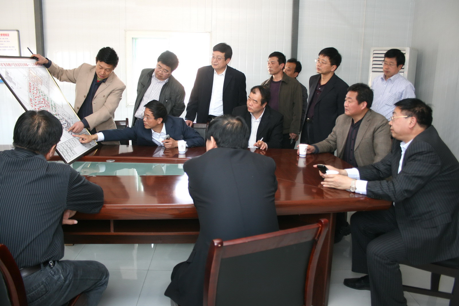 察看棚戶區(qū)改造項目規(guī)劃圖并就項目進展情況進行現(xiàn)場研究
