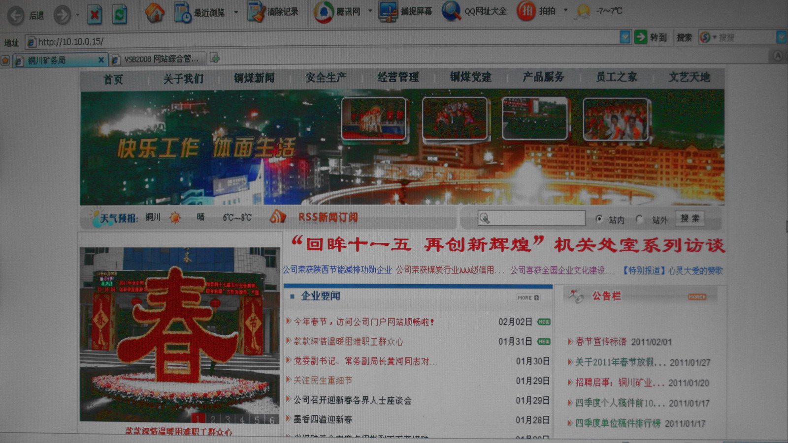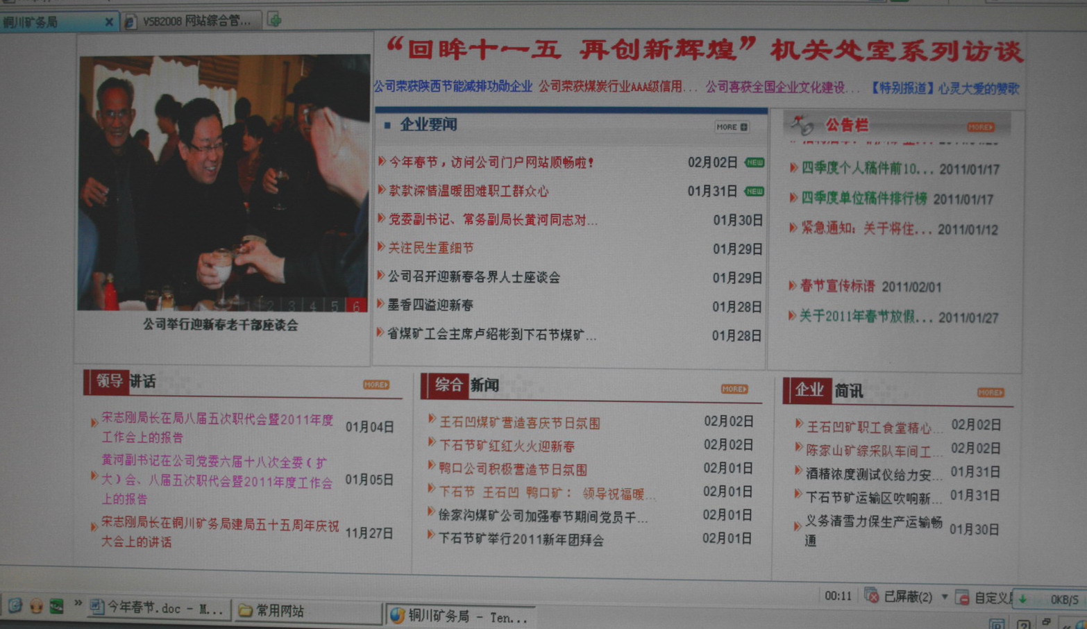 春節(jié)臨近,公司廣大職工群眾和社會各界人士在百忙中依然十分關心銅川礦業(yè)公司的發(fā)展變化和“十二五”開局之年的新面貌新氣象。與以往不同的是,今年春節(jié),大家足不出戶,便可通過互聯(lián)網輕松、順暢地訪問公司門戶網站,了解自己想要迫切知道的相關新聞及信息。不少人向公司黨委宣傳部和信息中心打來電話激動地說:“今年春節(jié),訪問咱們銅川礦業(yè)公司門戶網站順暢啦!”