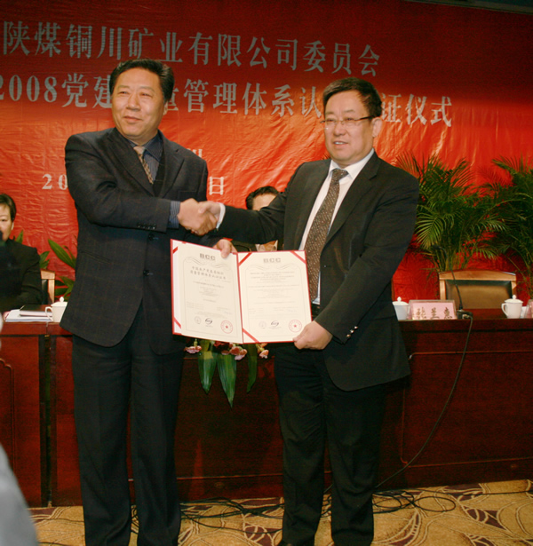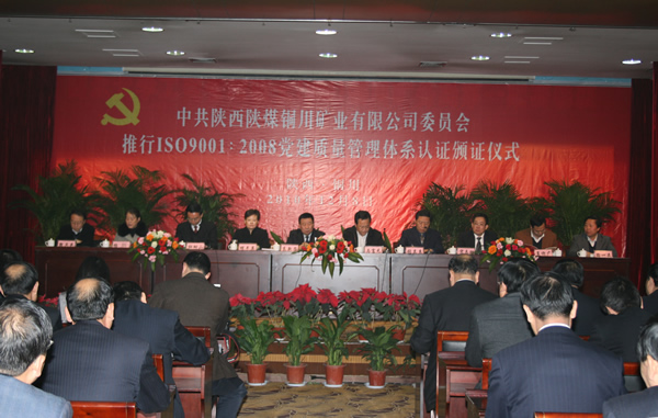公司黨委書記杜樹山主持了認(rèn)證頒證儀式。奏樂鳴炮開始。首先北京新世紀(jì)認(rèn)證有限公司西安分公司總經(jīng)理?xiàng)瞰h宣讀了銅川礦業(yè)公司黨建質(zhì)量管理體系現(xiàn)場審核結(jié)論;北京新世紀(jì)認(rèn)證有限公司副總經(jīng)理張?zhí)m惠宣讀了認(rèn)證文件。同時指出ISO9000質(zhì)量管理體系是世界通用的關(guān)于質(zhì)量管理和質(zhì)量認(rèn)證方面的體系。今年以來,銅川礦業(yè)公司黨委將其科學(xué)思想和先進(jìn)方法導(dǎo)入黨建工作,建立并實(shí)施黨建質(zhì)量管理體系,推動了黨建工作的規(guī)范化、標(biāo)準(zhǔn)化、程序化。