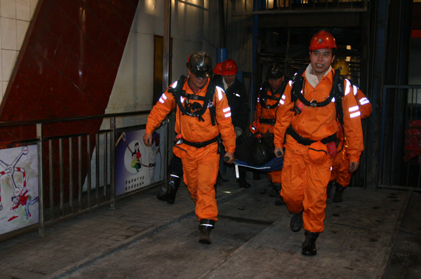 總經理宋志剛擔任總指揮,副總指揮由公司領導劉水利、張志文、郭寶輝擔任。安監(jiān)局、總調度室、通風處、生產處、動力處、救護大隊、地測處、勞社處、局中心醫(yī)院、供應處、行政處、宣傳部各部門負責人組成。職責分明,落實到人。在現(xiàn)場王石凹礦指揮中心,他們認真聽取了事故現(xiàn)場報告,仔細分析演練過程中出現(xiàn)的不符合邏輯地方,不斷修改完善。經過兩小時二十分鐘的緊張工作,救援隊員將火撲滅,并將兩名受傷人員成功救出,演練結束。總經理宋志剛親自到礦井口,向參加演練的礦工、礦山救護隊員和醫(yī)療救護隊員表示感謝,對演練效果給予充分肯定。
