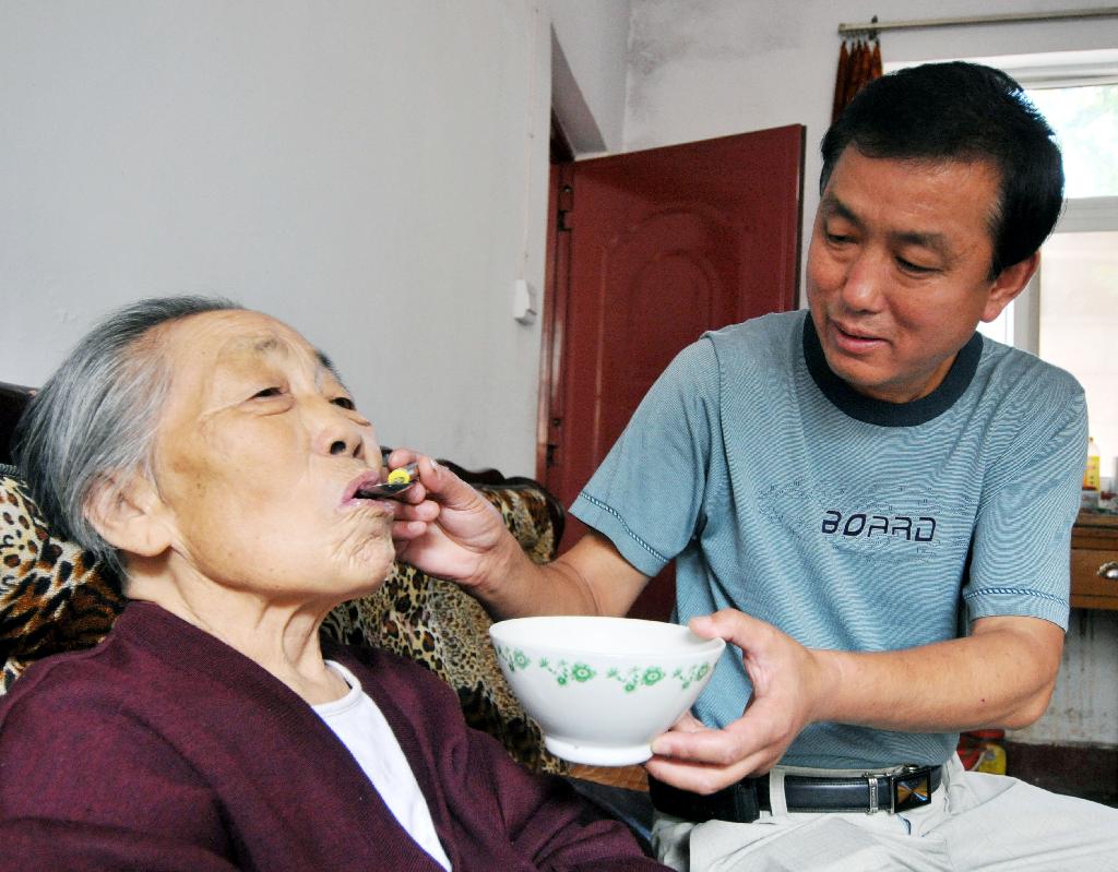 福無雙至禍不單行。也許是獨(dú)女的病逝,讓岳母唯一的精神支柱在時(shí)間的沙漏中一點(diǎn)一點(diǎn)潰敗,岳母更加沉默寡言,動(dòng)輒煩躁不安,經(jīng)常不明原因地暈倒、跌倒,而且出現(xiàn)手臂不聽使喚、健忘、記憶力衰退等癥狀,忠民對此憂心忡忡,帶著岳母上礦醫(yī)院檢查,診斷結(jié)果猶如晴天霹靂:腦梗,腦萎縮?不可能!絕對不可能!他簡直不敢相信自己的耳朵,但這卻是事實(shí),不容他不信!他流著淚懇求醫(yī)生:不論花多少錢,一定要治岳母的病,哪怕只有萬分之一的希望也決不放棄,在場的醫(yī)務(wù)人員無不為他的孝心感動(dòng)。在岳母面前,他強(qiáng)忍著悲痛把淚水往肚里咽,因?yàn)樵滥敢坏┲啦∏闀?huì)一下子崩潰的。于是,他細(xì)心地給岳母喂藥、喂飯、端屎端尿,天氣好的日子,忠民就把岳母背到院子里曬太陽,陪岳母嘮家常,忠民為岳母揉揉搓搓,防止手腳血液不流通。天熱了,他就為岳母擦洗身子。望著被折騰得渾身是汗的女婿,岳母無語凝噎,只是兩行淚順著臉頰直流。在忠民的耳濡目染下,忠民的兒女同樣十分孝敬奶奶。忠民的兒子為了奶奶的病也四處求醫(yī),打聽到哪里有好的藥,趕快買回給奶奶吃,岳母的病情慢慢穩(wěn)定了下來。