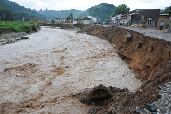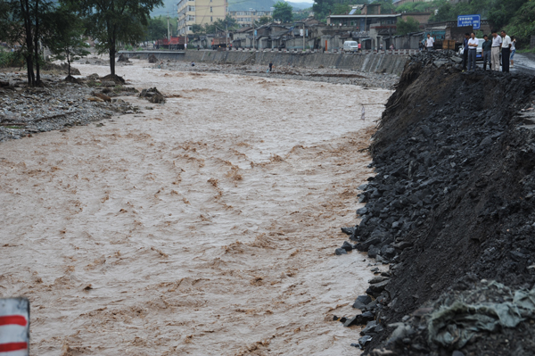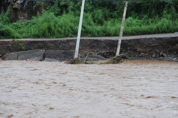 8月12日深夜至13日清晨,銅川再次遭受強(qiáng)降雨襲擊。銅川礦業(yè)公司陳家山煤礦所在地降雨量最大,為107mm。東店和石矸山上的8戶房屋后出現(xiàn)大面積滑坡,寨子溝家屬區(qū)5棟樓1樓全部進(jìn)水。礦區(qū)路人行道路邊垮塌地方多處,危機(jī)道路和行人安全。天然氣管路暴露150米,翻矸籠被水淹沒,影響正常翻矸(現(xiàn)已處理,恢復(fù)正常)。用電中斷,南、北兩處水源井和兩個(gè)污水處理廠停止運(yùn)行,影響居民用水和用電。而7月23日、8月1日兩次強(qiáng)降雨受災(zāi)嚴(yán)重的陳家山煤礦剛剛修復(fù)的簡(jiǎn)易路段在這次新一輪強(qiáng)降雨中被沖斷,進(jìn)入陳家山的所有道路全部被洪水摧毀,陳家山礦再次成為“孤島”。