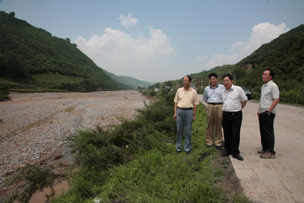 局領(lǐng)導(dǎo)看著退卻洪水的河面,安排下一步的工作