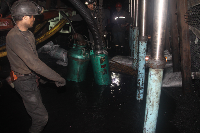 在發(fā)水現(xiàn)場(chǎng),綜采隊(duì)支部書記王愛民在受命的第一時(shí)間與兩名干部果斷指揮,撤出了當(dāng)班的所有工人,并勇敢地沖向正被迅速淹沒的機(jī)尾巷,將兩名受困工人安全撤出,避免了人員傷亡悲劇的發(fā)生,也為抗水救災(zāi)斗爭(zhēng)勝利進(jìn)行拉開了序幕。當(dāng)日晚10時(shí),根據(jù)災(zāi)情,礦黨政緊急召集采、掘、機(jī)、運(yùn)、通各部門部署救災(zāi)工作,成立了排水治水總指揮部??偨?jīng)理張會(huì)縣和黨委書記蘭阿利要求確保救災(zāi)人員安全,確保中央下山供電系統(tǒng)安全,確保礦井生產(chǎn)系統(tǒng)安全,并在排水過程中科學(xué)施工、力求環(huán)保。同時(shí)號(hào)召公司各級(jí)黨組織和黨員干部危難時(shí)刻顯氣節(jié),英勇奮戰(zhàn)作表率。一場(chǎng)可歌可泣的排水清淤會(huì)戰(zhàn)正式打響。