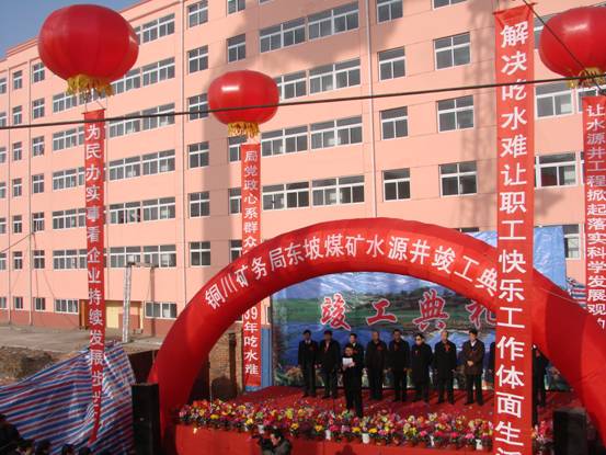 “世紀(jì)豐碑”,需要盛大典禮。2009年12月28日,礦務(wù)局以水源井竣工典禮為契機(jī),聯(lián)手東坡礦及禮儀公司,舉辦盛大典禮。礦區(qū)內(nèi),“感謝各級(jí)政府解決東坡礦39年吃水難”、“讓職工快樂(lè)工作、體面生活、共享改革發(fā)展成果”、“落實(shí)科學(xué)發(fā)展觀、大力實(shí)施惠民工程”等紅色橫幅迎風(fēng)招展,“熱烈祝賀水源井工程竣工”、“飲水思源用實(shí)際行動(dòng)回報(bào)為民惠民情”的彩虹橋與氣球讓礦山喜氣盈盈,坐在棚戶區(qū)改造工程塔吊上的建安工人在千米高空俯瞰,“世紀(jì)豐碑”遍布礦區(qū),紅綢鼓樂(lè)與禮炮奏響世紀(jì)交響,他們感嘆:東坡也是一座城市??!站在典禮場(chǎng)外的趙利山自豪地說(shuō):“2010年,我們建礦40周年,一個(gè)更加隆重的典禮,將為世紀(jì)豐碑喝彩添輝!”