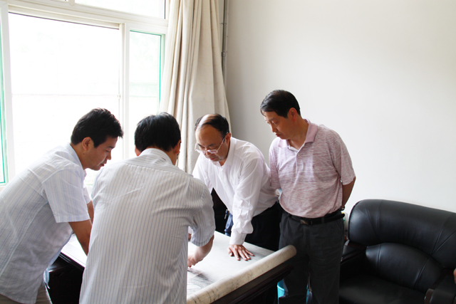 黃河在聽取了該公司總工程師景興平綜采2220工作面涌水情況及排治水工作進展匯報后,同該公司相關領導、技術人員對照有關圖紙,就該公司下一步防治水工作進行了認真研究部署。黃河強調(diào),由于采取了一些得力措施,水患有了一定程度的緩解,對工作面的正常生產(chǎn)影響不大,但要考慮到汛期的到可能會影響到排治水工作的正常開展。在近期工作中,要結合當前“三防”工作,圍繞安全、質量標準化、排水工作這三個方面,做到重心前移,重點下移,要以“如履薄冰”的危機感和責任感一如既往的抓好排水、清淤工作,要將清淤泥,排水工作上升到政治高度,全力保證排水管道暢通,保證設備正常運轉,保證綜采面正常生產(chǎn),防止水害對生產(chǎn)工作造成不利影響。圖為:常務副局長黃河同鴨口公司相關領導、技術人員對照有關圖紙,就該公司下一步防治水工作進行認真研究部署。