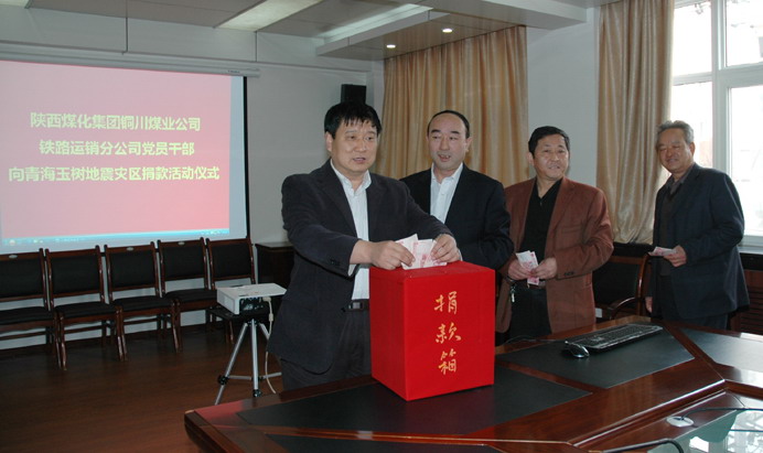 (通訊員于和平報(bào)道):2010年4月14日7時49分,青海玉樹縣發(fā)生7.1級地震,天災(zāi)無情人有情,玉樹,牽動鐵運(yùn)人的心。4月19日9:00時,銅川礦業(yè)公司鐵路運(yùn)輸公司在公司二樓會議室,公司黨政領(lǐng)導(dǎo)帶頭捐款,號召黨員干部職工群眾積極響應(yīng)主動捐款,弘揚(yáng)“一方有難,八方支援”的互助精神,發(fā)揚(yáng)鐵運(yùn)人“從嚴(yán)、務(wù)實(shí)、創(chuàng)新、奉獻(xiàn)”的企業(yè)精神,主動踐行企業(yè)社會責(zé)任,鐵運(yùn)人愿與災(zāi)區(qū)人民團(tuán)結(jié)一心,共克艱辛,共渡難關(guān)。銅煤鐵運(yùn)黨員干部224人向?yàn)?zāi)區(qū)捐款13670元。