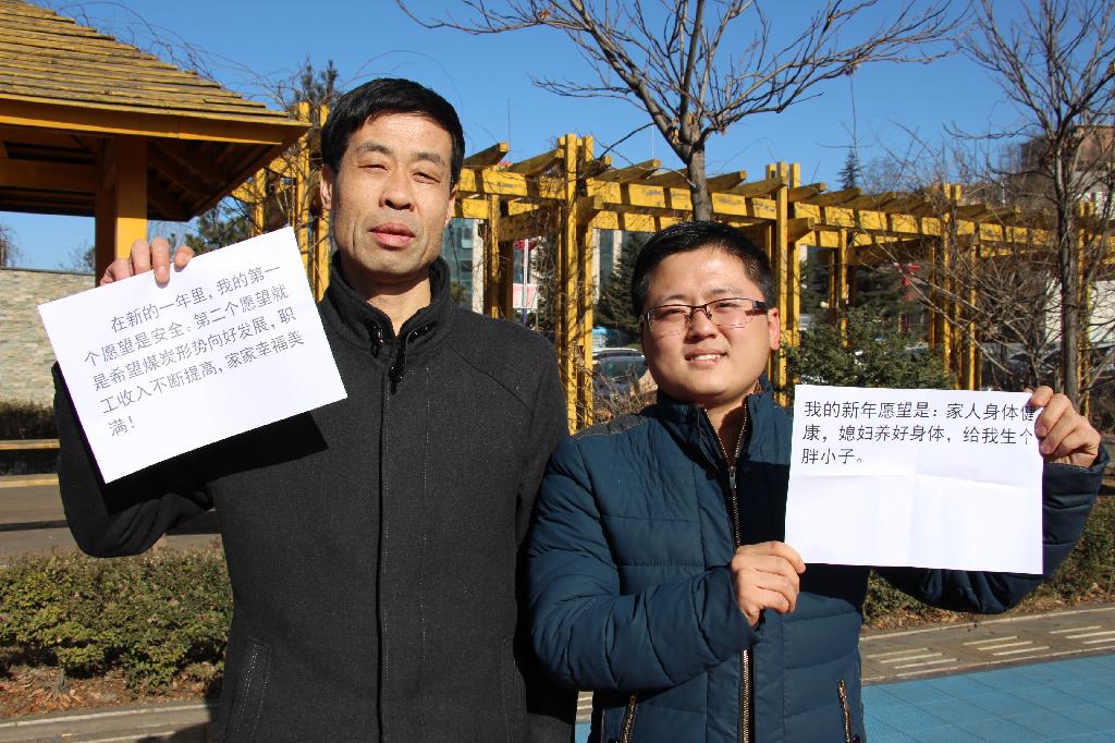 新年愿望:張占強說“我的愿望第一是安全,第二個是煤炭形勢向好發(fā)展,職工收入提高”。年輕的技術員張耀峰笑呵呵的說道:“媳婦現(xiàn)在懷孕了,我最大的愿望就是母子平安,媳婦給我生個大胖小子”。