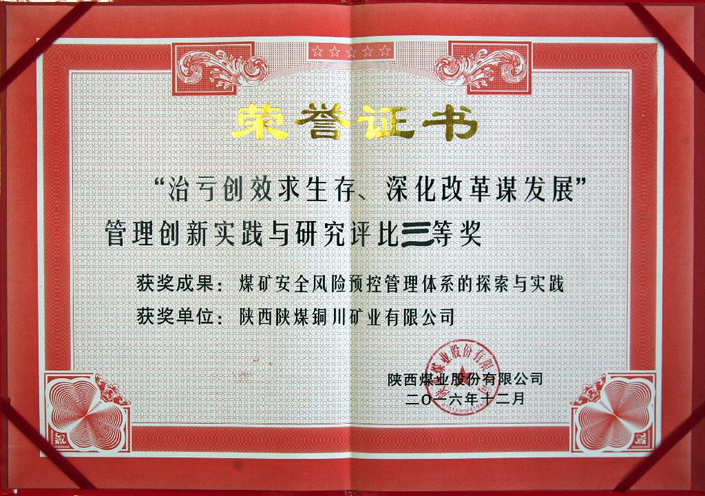 為深入貫徹落實陜煤化集團2016年工作會精神和陜西煤業(yè)2016年工作要點,近日,陜西煤業(yè)股份公司圍繞“治虧創(chuàng)效求生存、深化改革謀發(fā)展”主題舉辦了管理創(chuàng)新實踐與研究成果交流評比活動。在參與創(chuàng)新成果評選活動中,公司推薦的《煤礦安全風險預控管理體系的探索與實踐》課題研究成果喜獲三等獎。