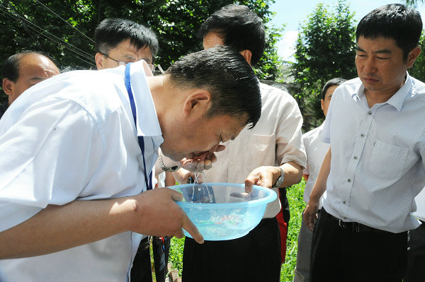 張應(yīng)龍一行到該礦生活處理污水站,對(duì)水質(zhì)在線監(jiān)測(cè)數(shù)據(jù)傳輸、污水處理工藝、相關(guān)設(shè)備的運(yùn)行情況進(jìn)行了實(shí)地查看,并就污水處理細(xì)節(jié)問題與陪同人員進(jìn)行了深入交流。在污水處理排水口,張應(yīng)龍親自盛滿一盆水,在陽(yáng)光下仔細(xì)查看水樣,當(dāng)看到清澈如鏡的水樣,不住點(diǎn)頭稱贊。