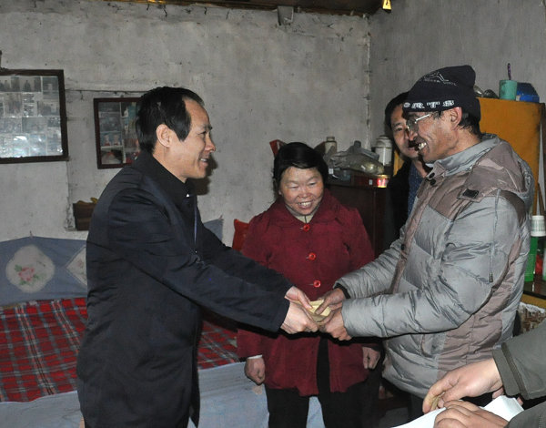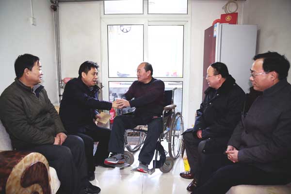 在玉華礦困難職工史卜利家中,王蓬詳細詢問了解了他的生活和家庭情況,并叮囑他要相信組織、相信企業(yè),照顧好自己的身體,早日康復。在玉華礦困難職工王西寧家,王蓬親切的拉著王西寧的手說,“新春佳節(jié)就要到來,我代表公司黨政來看望你,給你拜個早年,希望你樹立戰(zhàn)勝病魔的信心,積極治療,調節(jié)飲食,早日恢復健康”。在史家河社區(qū)困難職工李振有家中,王蓬詳細詢問了李振有的生活和身體情況,叮囑老人一定要保重身體,安心養(yǎng)病,并對老人說,企業(yè)的穩(wěn)定和發(fā)展離不開退休職工的關心與支持,我們要精心安排好老同志的生活,盡最大能力幫助他們解決困難,讓他們老有所養(yǎng)、老有所樂。在史家河社區(qū)困難職工職工潘素根家中,在得知潘素根本人身體有病,老伴多年癱瘓在床,家中生活極為清貧,現在作為重點優(yōu)撫對象,社區(qū)每年都給予他照顧時,王蓬動情的說:“離退休老同志為曾為銅川礦區(qū)的建設做出了突出貢獻,我們各級組織一定要以強烈的事業(yè)心和責任感,解決老同志在生活中的實際困難和問題。雖然煤炭行業(yè)處于低谷,但組織依然會盡最大努力,幫助困難職工度過難關”。潘素根感動說:“謝謝局黨政對我們的愛護,有你們的關懷,我們一定會樹立信心,戰(zhàn)勝目前的生活困難?!?/p>