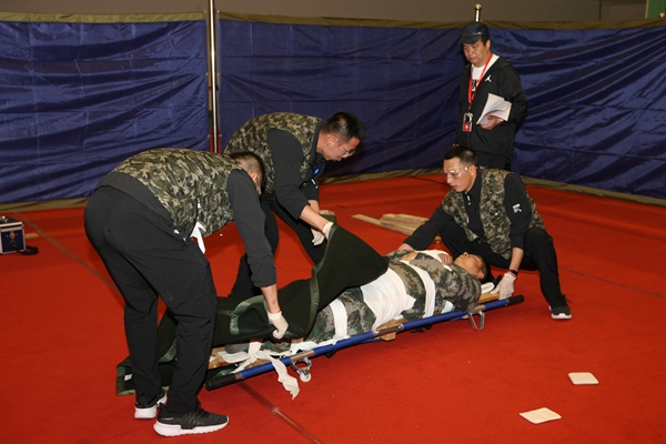 室外競(jìng)賽激烈角逐,位于銅川礦業(yè)公司礦山救護(hù)大隊(duì)綜合訓(xùn)練館內(nèi)的醫(yī)療綜合體能競(jìng)賽中也精彩紛呈。競(jìng)賽中醫(yī)療救護(hù)各參賽隊(duì)隊(duì)員緊張忙碌地進(jìn)行著傷員心肺復(fù)蘇及創(chuàng)傷急救,止血、包扎、固定、搬運(yùn)等各個(gè)動(dòng)作相互銜接、標(biāo)準(zhǔn)到位、忙而不亂、緊湊有序,既充分展示了日常訓(xùn)練和實(shí)戰(zhàn)歷練的技術(shù)素養(yǎng),又有效檢驗(yàn)了醫(yī)療救援隊(duì)伍的業(yè)務(wù)技能和綜合素質(zhì)。
