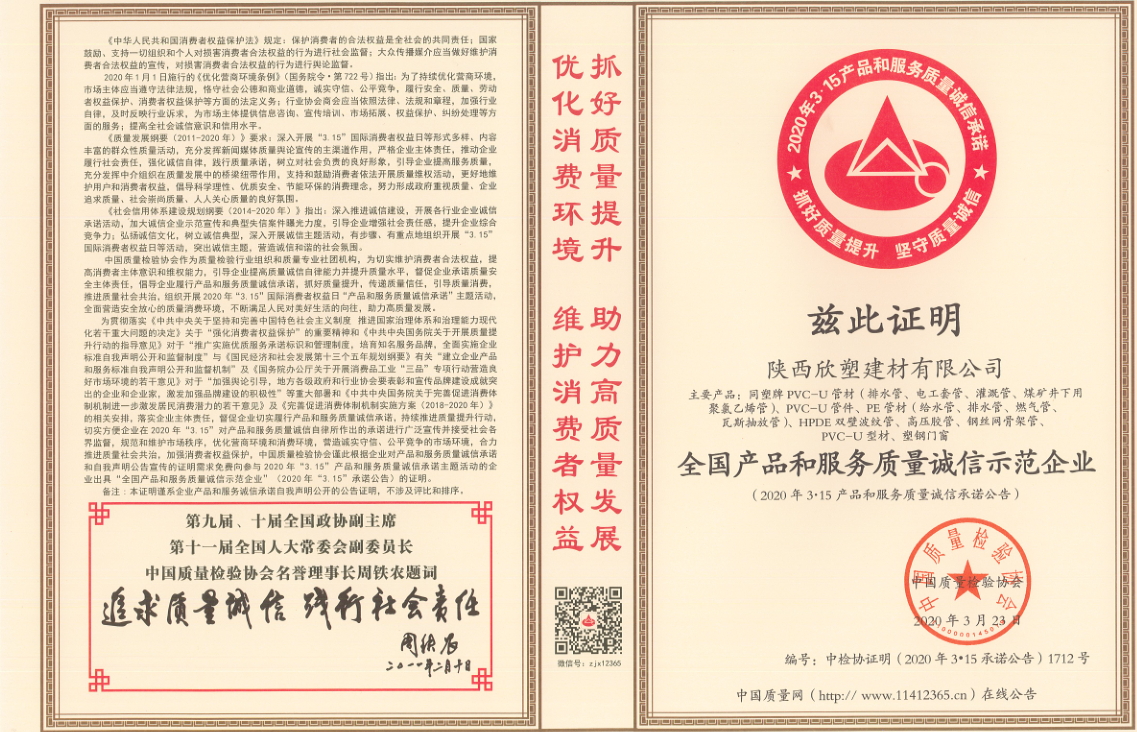 近日,在中國質(zhì)量檢驗協(xié)會主辦的2020年“3?15”國際消費者權(quán)益日“產(chǎn)品和服務質(zhì)量誠信承諾”主題活動中,欣塑公司憑借過硬的產(chǎn)品質(zhì)量和一流的服務水平,榮獲“全國產(chǎn)品和服務質(zhì)量誠信示范企業(yè)”殊榮。