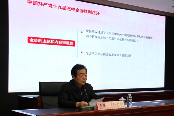 宣講會(huì)上,劉水利對(duì)黨的十九屆五中全會(huì)召開的背景、全會(huì)的主題、內(nèi)容和全會(huì)對(duì)中國發(fā)展的重大作用進(jìn)行了闡述,著重圍繞習(xí)近平總書記在全會(huì)上發(fā)表的重要講話和全會(huì)通過的《中共中央關(guān)于制定國民經(jīng)濟(jì)和社會(huì)發(fā)展第十四個(gè)五年規(guī)劃和二○三五年遠(yuǎn)景目標(biāo)的建議》,從“深刻認(rèn)識(shí)我國進(jìn)入新發(fā)展階段的重大意義、有利條件和重要特征;準(zhǔn)確把握2035年遠(yuǎn)景目標(biāo)和‘十四五’時(shí)期我國發(fā)展的指導(dǎo)方針、主要目標(biāo)、重點(diǎn)任務(wù);牢牢把握構(gòu)建新發(fā)展格局的戰(zhàn)略構(gòu)想和重要著力點(diǎn);堅(jiān)持黨的全面領(lǐng)導(dǎo),動(dòng)員各方面力量為實(shí)現(xiàn)‘十四五’規(guī)劃和2035年遠(yuǎn)景目標(biāo)而團(tuán)結(jié)奮斗”四個(gè)方面,對(duì)全會(huì)精神進(jìn)行了全面系統(tǒng)、精準(zhǔn)細(xì)致的闡釋解讀,并對(duì)進(jìn)一步貫徹落實(shí)全會(huì)精神提出了要求。