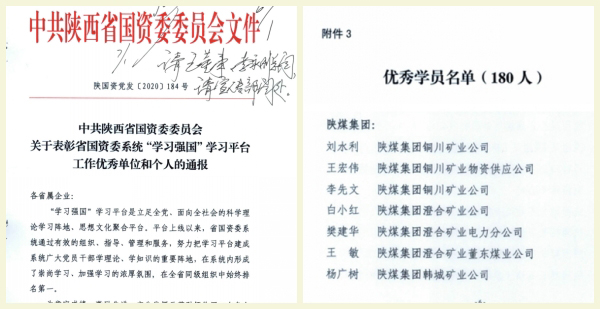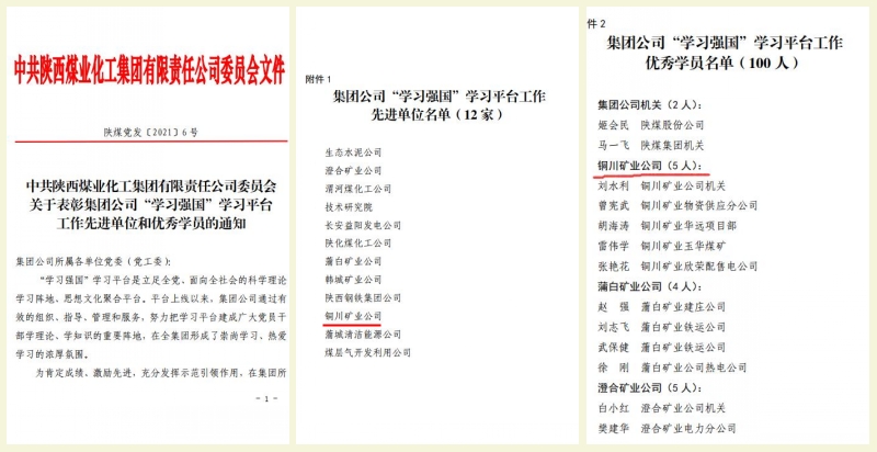 近日,陜西省國資委委員會(huì)和陜煤集團(tuán)黨委分別下發(fā)了《關(guān)于表彰“學(xué)習(xí)強(qiáng)國”學(xué)習(xí)平臺(tái)工作先進(jìn)單位和優(yōu)秀學(xué)員的通報(bào)》。在省國資委通報(bào)表彰中,公司劉水利等3人被評(píng)為先進(jìn)個(gè)人。在陜煤集團(tuán)通報(bào)表彰中,公司曾憲武等5人被評(píng)為先進(jìn)個(gè)人。公司“學(xué)習(xí)強(qiáng)國”學(xué)習(xí)平臺(tái)應(yīng)用工作榮獲陜煤集團(tuán)先進(jìn)單位。