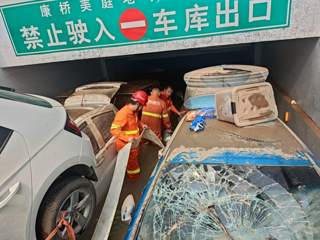該市康橋美庭小區(qū)在此次暴雨襲擊中,受災(zāi)最為嚴(yán)重的是地下停車場(chǎng)和地下超市全部被水淹沒(méi),預(yù)計(jì)水量達(dá)5萬(wàn)余m3。面對(duì)災(zāi)情,公司救援隊(duì)立即勘察現(xiàn)場(chǎng),迅速制定方案,分別采用大功率潛水泵對(duì)兩個(gè)地方進(jìn)行排水作業(yè)。