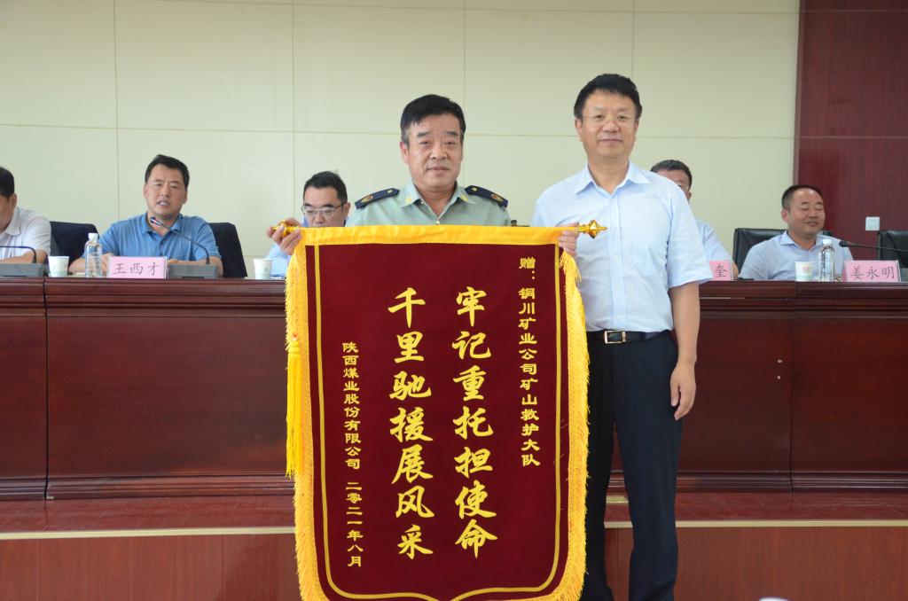 陜煤集團(tuán)煤炭事業(yè)部副經(jīng)理、陜西煤業(yè)副總經(jīng)理張森為救護(hù)大隊頒發(fā)了“千里馳援展風(fēng)采,牢記重托擔(dān)使命”的錦旗,并對公司救護(hù)大隊在本次抗洪搶險救災(zāi)工作中的突出表現(xiàn)給予了充分肯定和高度贊揚。