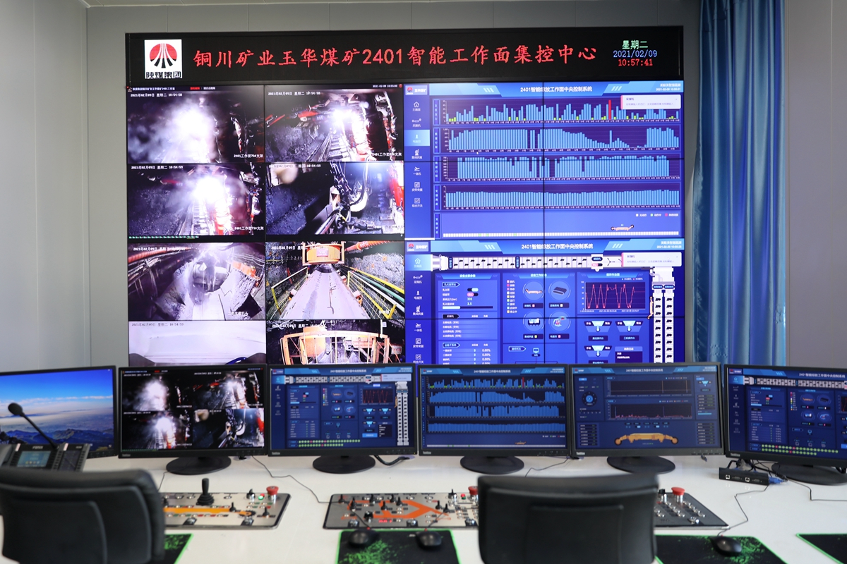 10月27日,記者走進(jìn)玉華煤礦2401智能化工作面地面控制中心,電子屏上“2401智能綜放工作面中央控制系統(tǒng)”正實(shí)時(shí)播報(bào)著千尺井下前后部機(jī)頭一體機(jī)、前后部機(jī)尾一體機(jī)、轉(zhuǎn)載機(jī)即整個(gè)綜采系統(tǒng)核心機(jī)械——“三機(jī)”作業(yè)中的母線電壓、軸承溫度、腔體濕度、冷卻水壓力、運(yùn)行時(shí)間等數(shù)據(jù),技術(shù)人員根據(jù)這些具體數(shù)據(jù)遠(yuǎn)程遙控井下工作面生產(chǎn)。旁邊信息監(jiān)控調(diào)度指揮中心,偌大的電子屏幕上全視角顯示著井底智能采煤設(shè)備實(shí)時(shí)運(yùn)行的工作畫面,只見光線明亮、場面壯觀日產(chǎn)約8000噸煤炭的工作面,為數(shù)不多的工作人員穿著整潔的服裝,要么在巡回檢查,要么在檢修設(shè)備,整個(gè)工作面的生產(chǎn)場景,看起來既轟轟烈烈,又輕松自如,徹底顛覆了文學(xué)作品《平凡的世界》中對過去煤礦井下生產(chǎn)的烏黑、勞苦、危險(xiǎn)等固有印象的認(rèn)識。