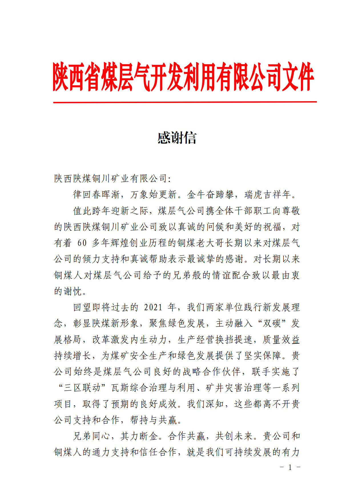 新年來臨之際,陜西煤層氣開發(fā)利用有限公司向銅川礦業(yè)公司發(fā)來感謝信,對公司一直以來對陜西煤層氣公司改革發(fā)展給予的關注支持表示衷心的感謝,希望在新的一年雙方進一步共同合作、攜手發(fā)展,為陜煤集團爭創(chuàng)世界一流企業(yè)作出新貢獻。