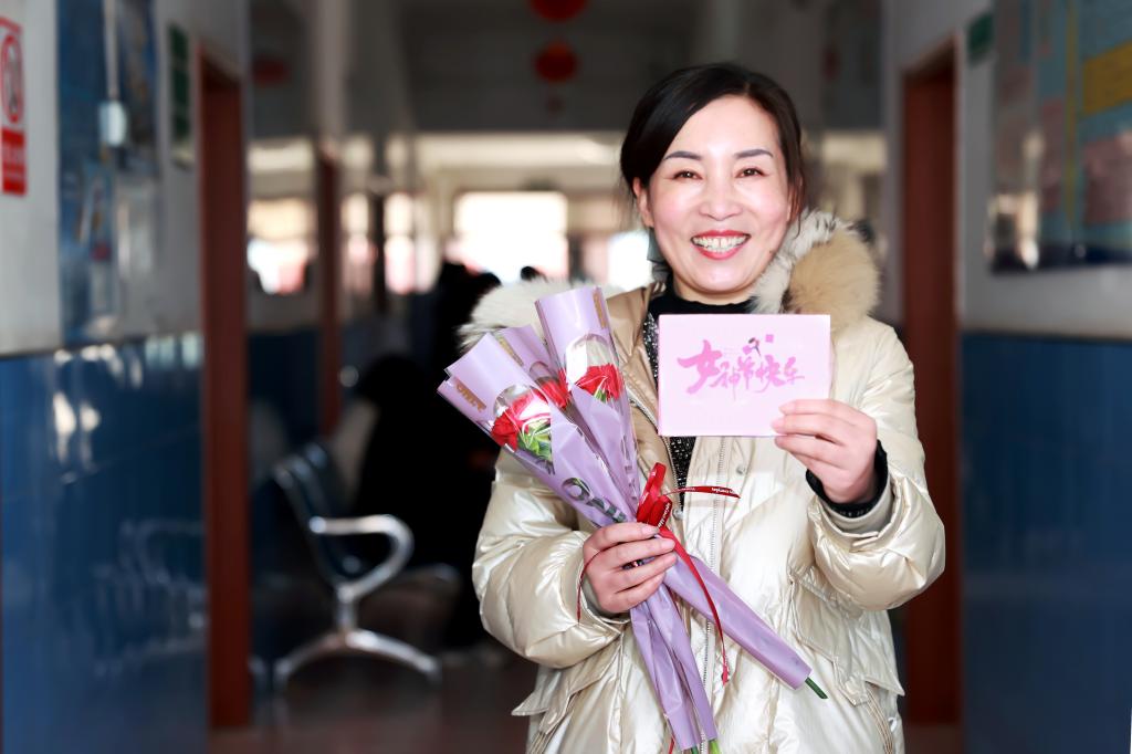 “沒想到這個(gè)節(jié)日,我還能沾上老公的光,他這個(gè)先進(jìn)也讓我感到自豪和光榮?!币晃粍谀4淼钠拮永罨埯愂峙貂r花,手拿體檢卡高興地說道。