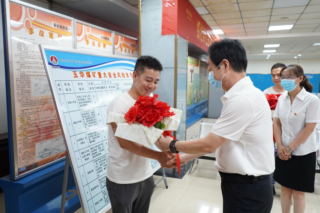現(xiàn)場觀摩期間,與會人員還一起參與了該礦正在井口候車大廳開展的為七一當(dāng)天過生日的職工“送生日祝福 囑安全生產(chǎn)”親情服務(wù)活動。在活動現(xiàn)場,公司黨委書記、董事長劉水利與3名過生日的職工進行了親切交談,他說“你們的生日與黨的生日是同一天,這很有紀(jì)念意義,你們是礦區(qū)的建設(shè)者,在此向大家送上生日的祝福,希望你們牢記職責(zé)、肩負(fù)使命、安全生產(chǎn),為企業(yè)發(fā)展做出新的更大的貢獻。”在眾人齊唱生日快樂的歌聲中,劉水利為過生日的職工送上了鮮花、賀卡和生日祝福,讓職工們備受感動、鼓舞和激勵。