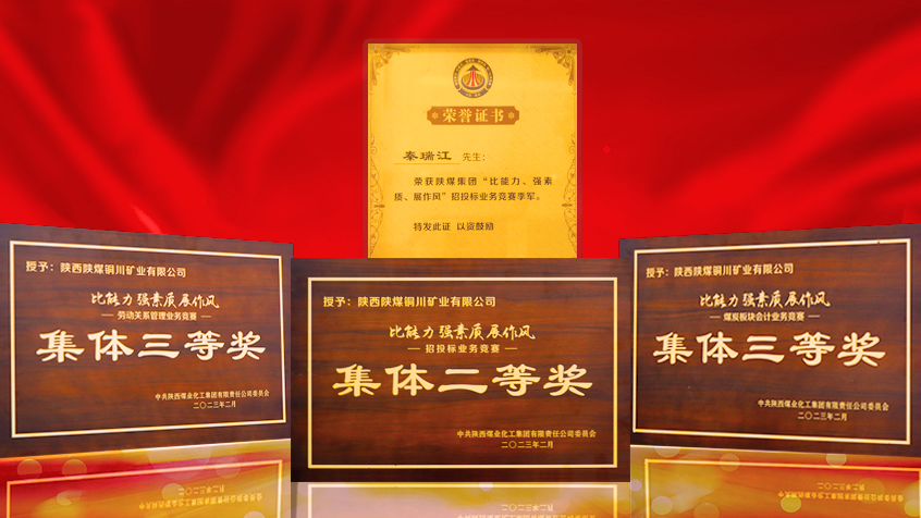 2月16日,陜煤集團2022年度“最美員工”暨“比能力、強素質(zhì)、 展作風”部門業(yè)務(wù)競賽頒獎晚會在西咸國際會議中心舉行。會上,公司被授予“招投標業(yè)務(wù)競賽”集體二等獎、“煤炭板塊會計業(yè)務(wù)競賽”集體三等獎、“勞動關(guān)系管理業(yè)務(wù)競賽”集體三等獎,公司職工秦瑞江榮獲“招投標業(yè)務(wù)競賽”季軍,一并受到表彰。