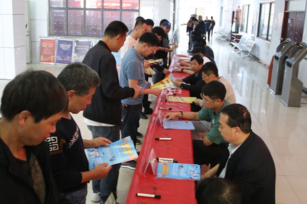 柴家溝井活動現(xiàn)場,該礦為職工發(fā)放宣傳資料,現(xiàn)場解答職工咨詢安全生產(chǎn)等方面知識,參會人員分別在安全承諾橫幅上簽名。(強壯)