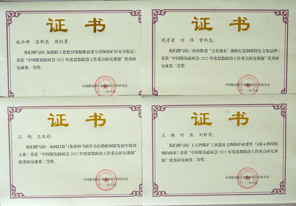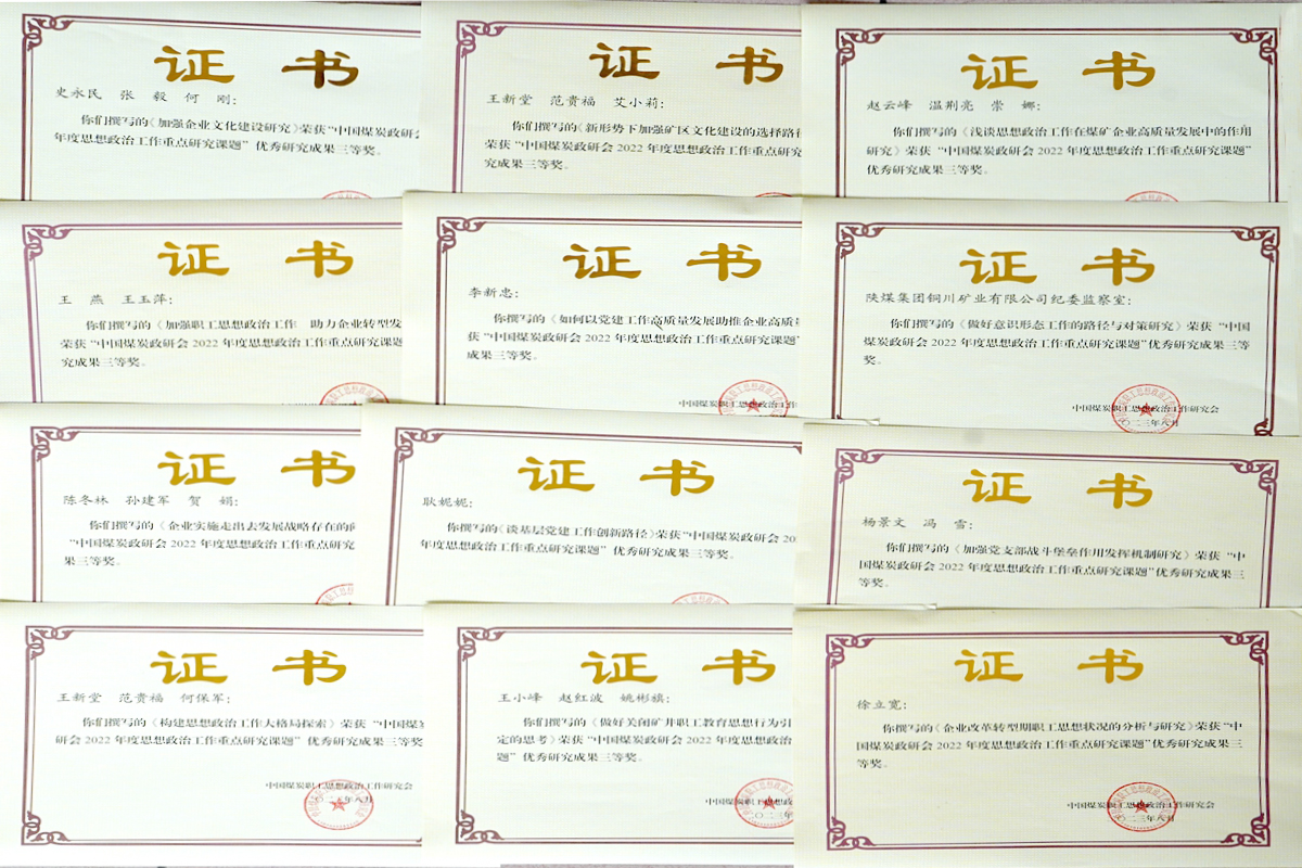在本次受表彰的全煤系統(tǒng)思想政治工作重點研究課題成果發(fā)布會上,共有全煤行業(yè)的11家單位榮獲優(yōu)秀組織獎,其中公司是本次課題研究成果發(fā)布會上陜煤集團所屬單位中唯一獲得優(yōu)秀組織獎的集團二級單位。在受表彰的全煤行業(yè)優(yōu)秀課題研究成果中,共有84項成果榮獲一等獎、140項成果榮獲二等獎、307項成果榮獲三等獎。其中,公司5個黨群部門、3個礦井、6個生產(chǎn)輔助單位的33名作者撰寫的16篇課題研究成果,榮獲一等獎1篇、二等獎3篇、三等獎12篇,課題內(nèi)容涵蓋了黨建工作研究、企業(yè)文化建設(shè)、意識形態(tài)工作、群團隊伍建設(shè)、深化改革創(chuàng)新、企業(yè)轉(zhuǎn)型發(fā)展、工業(yè)遺產(chǎn)保護利用等兼具理論指導和實踐價值的多項理論研究成果,一并受到了大會的表彰獎勵,并實現(xiàn)了獲獎格次、數(shù)量和質(zhì)量的新突破。