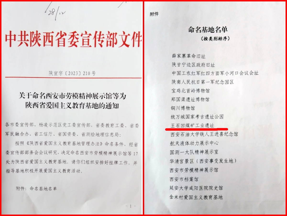 近日,中共陜西省委宣傳部下發(fā)《關(guān)于命名西安市勞模精神展示館等為陜西省愛國主義教育基地的通知》,全省17家單位被命名為省級(jí)愛國主義教育基地,王石凹煤礦工業(yè)遺址名列其中。