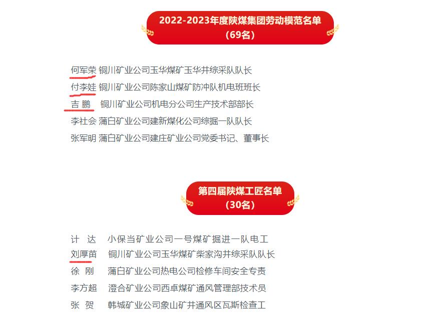 4月23日,陜煤集團(tuán)召開2022-2023年度文明單位暨勞動(dòng)模范、陜煤工匠表彰大會(huì),公司玉華煤礦被評(píng)為陜煤集團(tuán)文明單位,公司員工何軍榮、付李娃、吉鵬榮獲陜煤集團(tuán)勞動(dòng)模范稱號(hào),公司員工劉厚苗被授予第四屆陜煤工匠稱號(hào)。