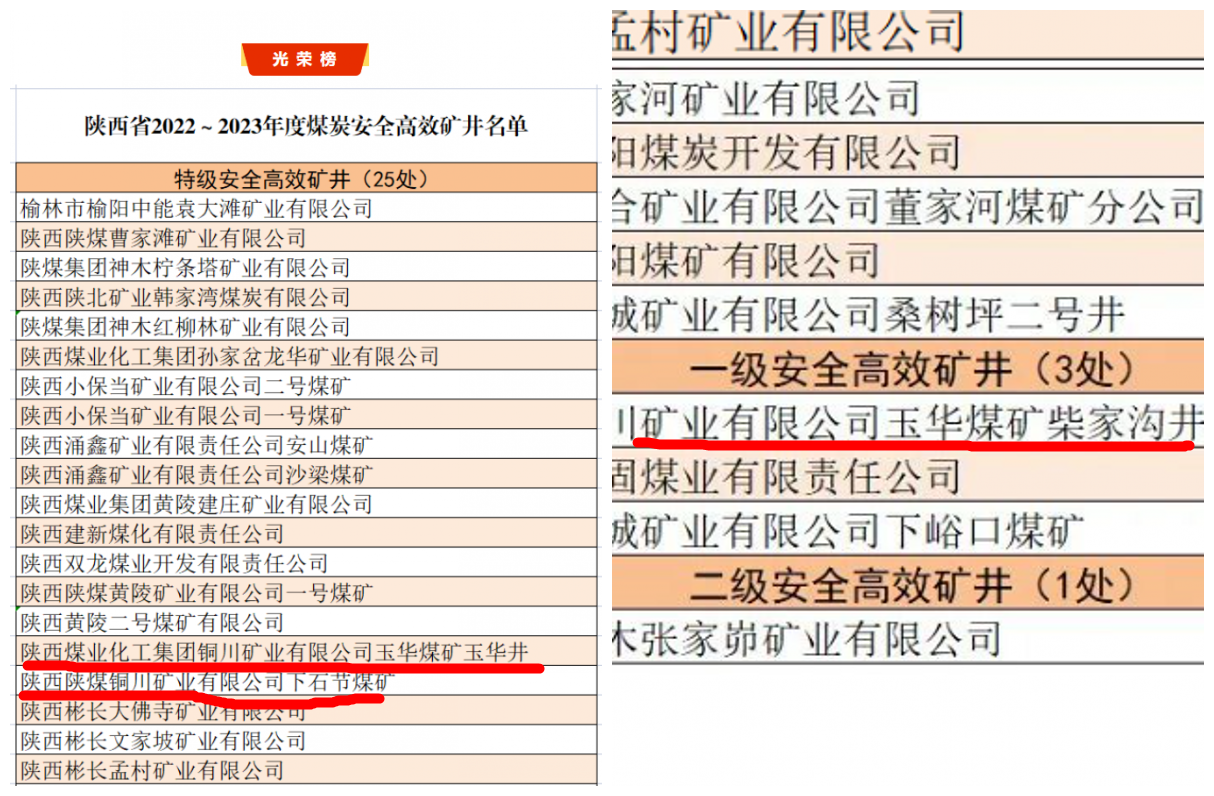 近日,陜西省應(yīng)急管理廳、國(guó)家礦山安全監(jiān)察局陜西局、陜西省煤炭工業(yè)協(xié)會(huì)聯(lián)合命名發(fā)布了2022—2023年度陜西省煤炭安全高效礦井名單,公司所屬玉華礦、下石節(jié)礦獲評(píng)陜西省特級(jí)安全高效礦井,柴家溝井獲評(píng)一級(jí)安全高效礦井。