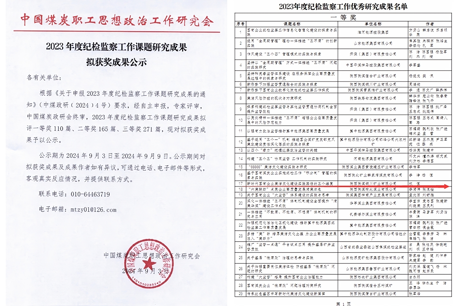 近日,在中煤政研紀(jì)檢監(jiān)察優(yōu)秀研究成果發(fā)布會上,公司紀(jì)委榮獲“2023年度紀(jì)檢監(jiān)察工作課題研究活動優(yōu)秀組織單位”,公司31篇紀(jì)檢監(jiān)察工作研究成果榮獲中煤政研會“2023年度紀(jì)檢監(jiān)察工作優(yōu)秀研究成果獎”。其中,一等獎7篇,二等獎7篇,三等獎17篇。此次活動由中國煤炭職工思想政治工作研究會主辦,對紀(jì)檢監(jiān)察研究學(xué)組成員單位11個集體、547篇研究成果進(jìn)行了表彰。