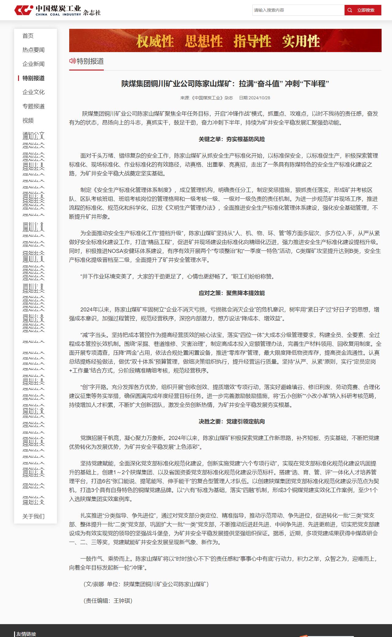 中國(guó)煤炭工業(yè)雜志| 陳家山煤礦:拉滿“奮斗值” 沖刺“下半程”