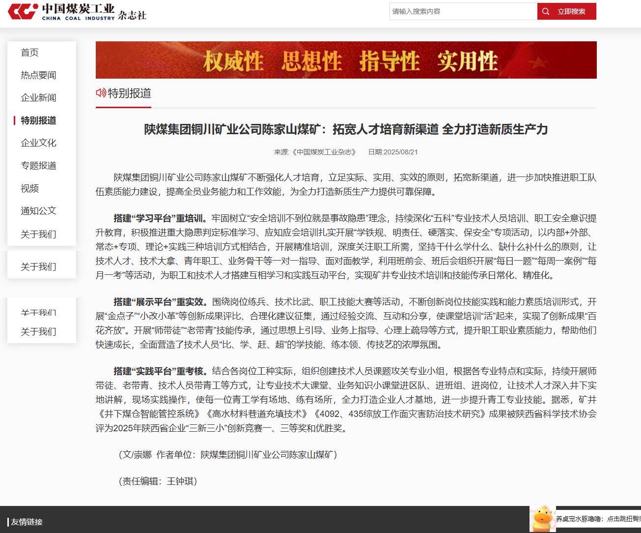 中國煤炭工業(yè)雜志| 陳家山煤礦:拓寬人才培育新渠道 全力打造新質生產力
