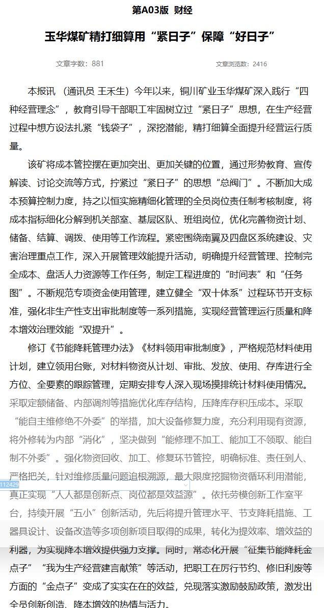 銅川日報| 玉華煤礦精打細算用“緊日子”保障“好日子”