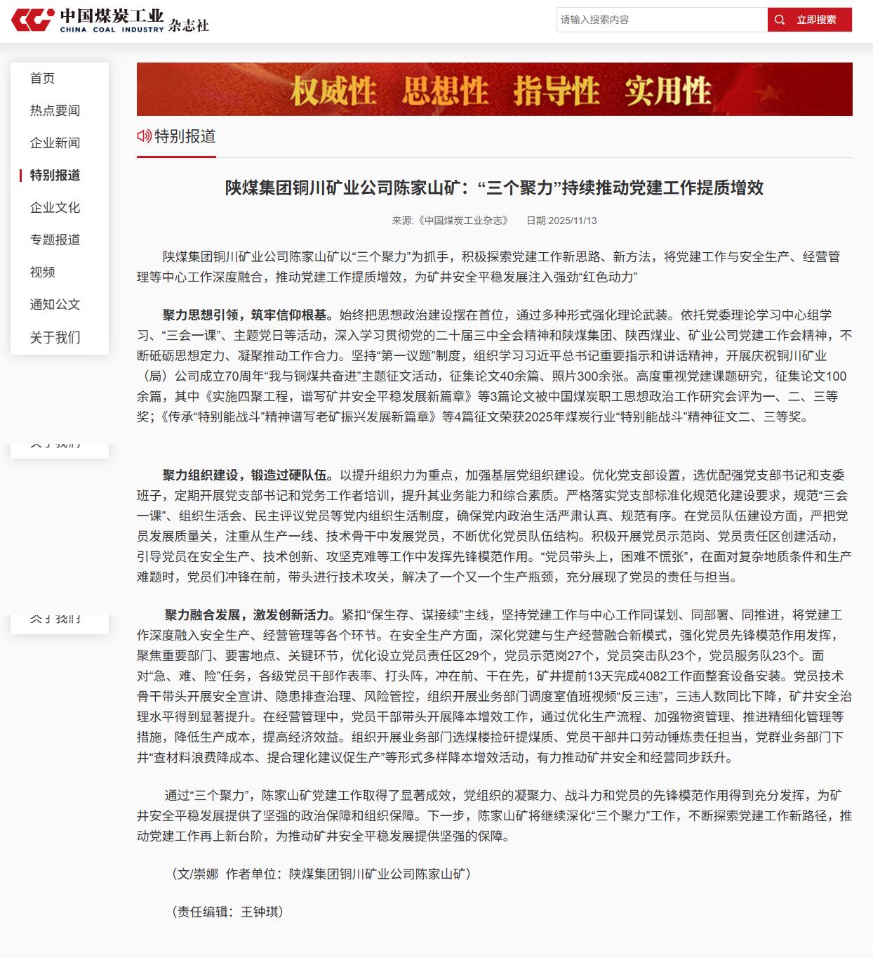 中國煤炭工業(yè)雜志| 陳家山礦:“三個聚力”持續(xù)推動黨建工作提質增效