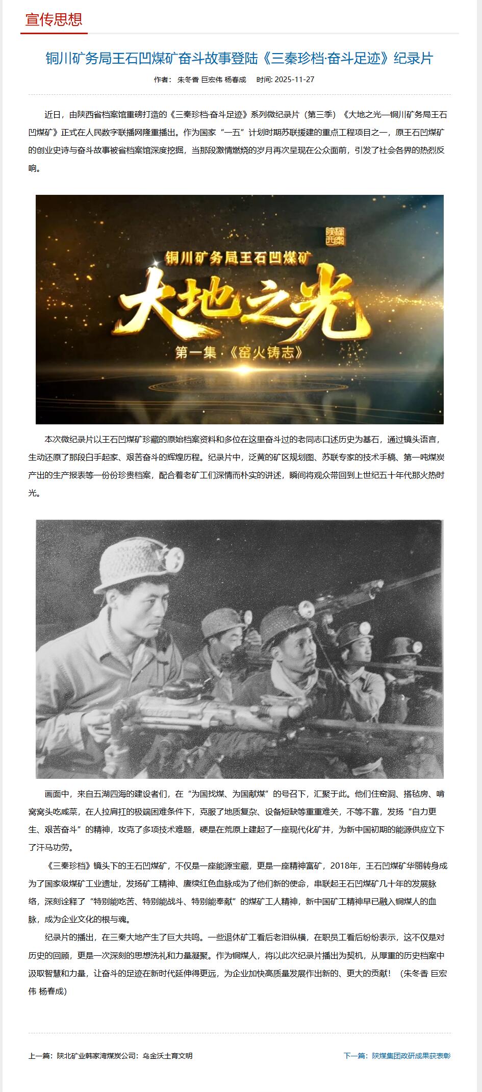 集團網| 王石凹煤礦奮斗故事登陸《三秦珍檔·奮斗足跡》紀錄片